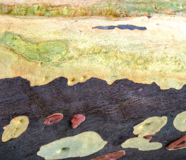 A close-up of the trunk of a bark shedding Eucalypt resembles a landscape