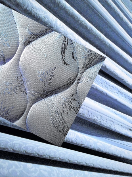 Folds and embossment of pale blue velvet curtains and a snapshot of an old, faded mattress close up.