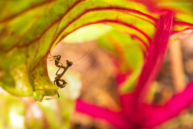 A young mantis takes shelter in my rainbow chard Olympus TG-6, 18 mm, 1/100 sec at f/4.9, ISO 1600.