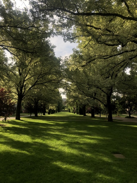 This image was taken at the Australian National University in Canberra looking down a grassy path shaded by trees.
