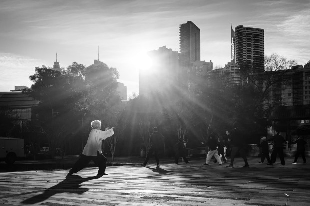 I felt uplifted watching the bright early sun casting such beautiful light over this calming scene of outdoor Tai Chi.