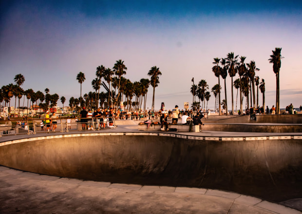Venice beach in Los Angelesis a place where people leave the privacy of their homes to enjoy the great outdoors. Even at dusk the area is a hive of activity.