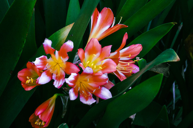 Colourful flowers against a backdrop of green leaves.