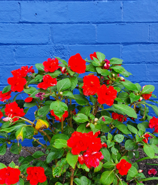 Some flowers sitting against a bright blue wall that I walk past nearly every day and it catches my eye.