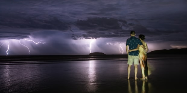 A couple watch an intense electrical storm heading out to sea off the coastline of the. Coffs Coast