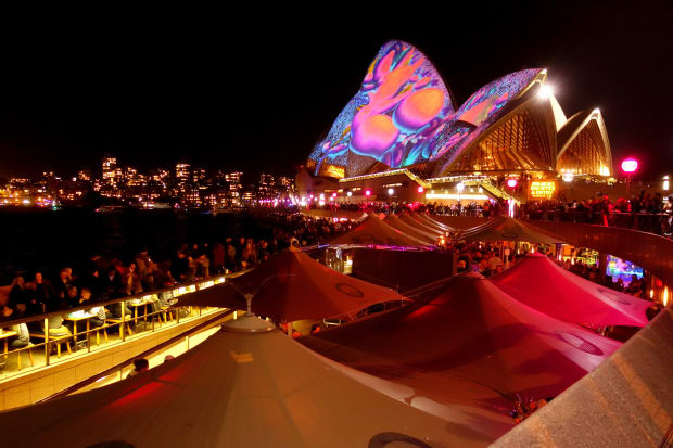 This image shows the ambience of the Vivid festival in Sydney, with thousands of people out enjoying the spectacle.
