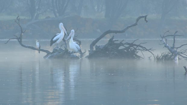 pelicans waiting for the sun to come up and the fog to clear at dawn