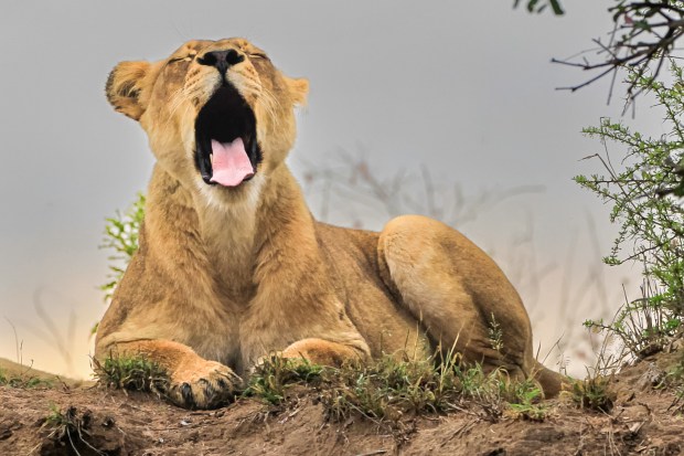 A lioness yawns as the sun comes up