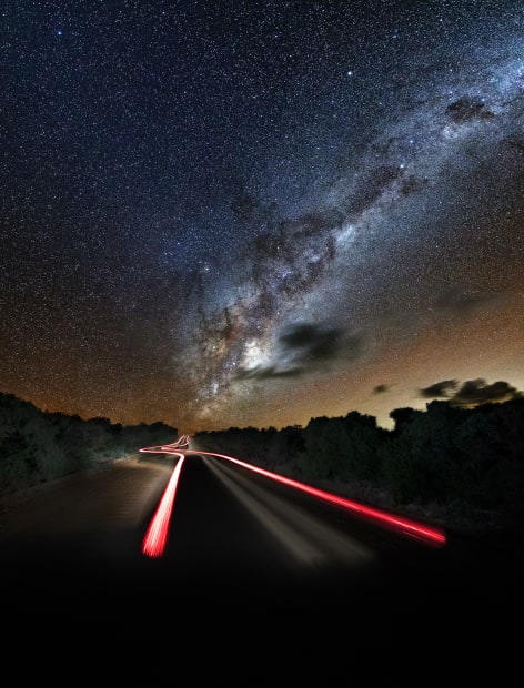Photographed on a country road in Western Australia. Found a road leading East where the Milky Way would rise on the horizon and using car lights to produce the light trail leading directly to the Milky Way core.
