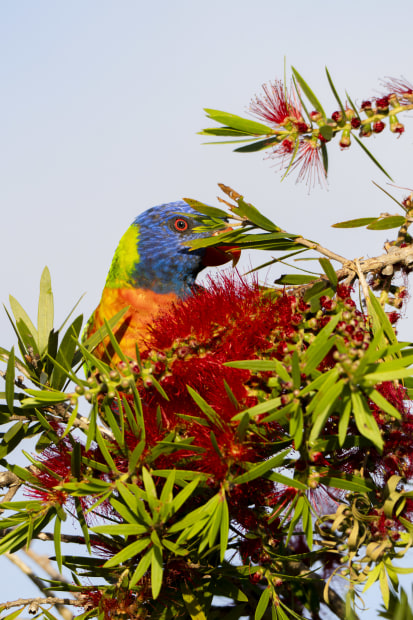 The Rainbow Lorakeet peeks through the Callistemon tree, with a watchful eye. The photographer held still, careful not move or make a sound.