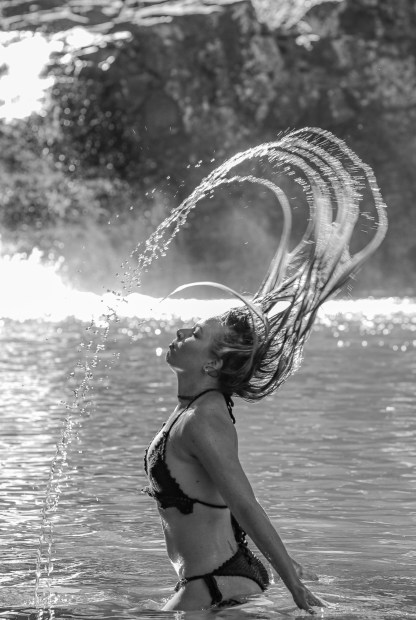 water droplets in a line when she flips her hair