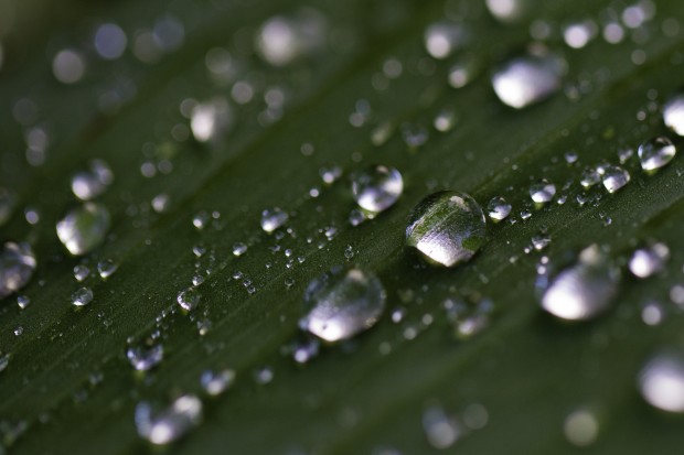 Water droplets running off a banana leaf during a shower shot using a canon macro EF 100mm lens