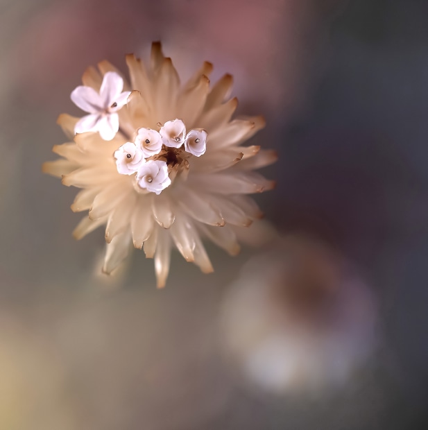 A windy day ensured a nice blur. My goal was to get the warm background bokeh surrounding the Ursinia plant going to seed.