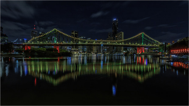 The calmest waters I've seen in this part of the Brisbane River, creating beautiful reflections of the bridge and city lights Canon 6d ii Sigma 14 - 24mm @ 16mm 20sec f11 ISO 100