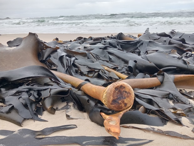 Stormy weather delivered bull kelp upon the beach.
