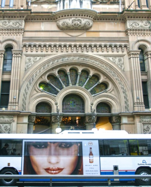 An ad on the bus adds a quirky dimension to this Sydney CBD image outside QVB which is full of lines, shapes and patterns.