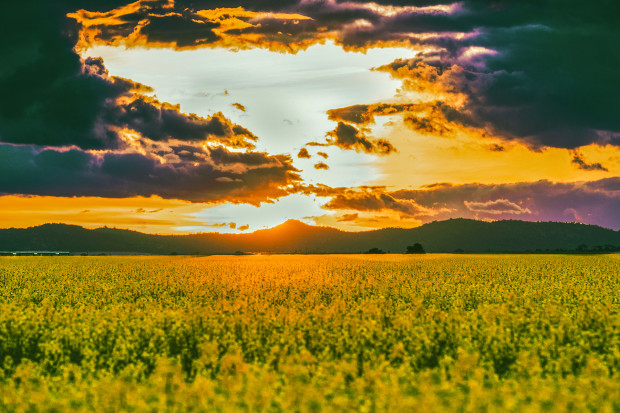 Extreme clouds framing the You Yangs, Victoria at sunset. The glow of the sun cast a red tint over the vast yellow fields of canola.