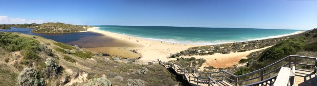 Moore River in Guilderton, WA meets the ocean, split by a sandbar in the middle