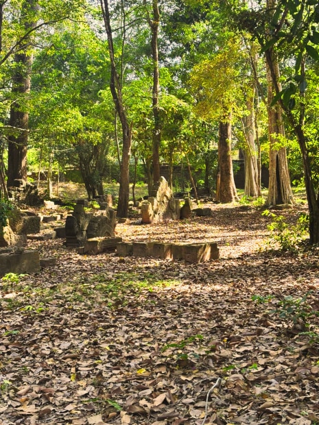 Ruins under a forest canopy, where the sun shines down, reuniting the once bustling temple with the sun.