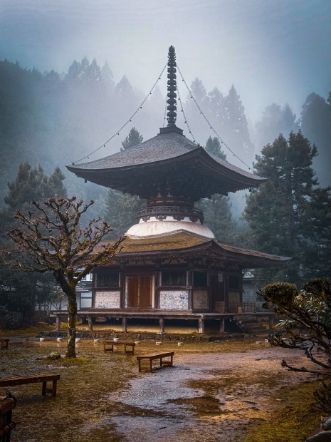 Rain falls softly at Kongō-Sanmai-in, Kōyasan, as mist drifts through the forest and the pagoda emerges from the fog, creating an ethereal moment where nature, rain, and ancient architecture meet in quiet harmony.