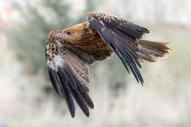 An Australian Whistling Kite flying past the fields