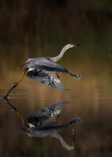 A White-faced Heron lifting off from The Lagoon in the golden early morning light