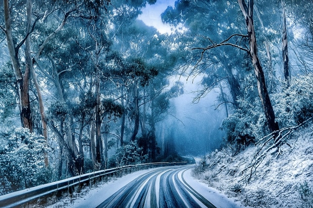 A winter wonderland on Mount Canobolas, Orange NSW. Snow-dusted gums and a winding road vanish into the mist — a peaceful, frozen escape.
