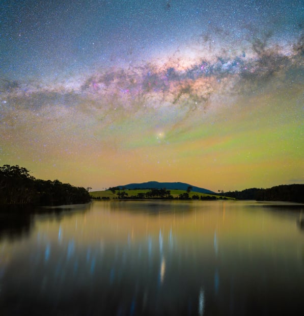 Brilliant orange and green airglow fills the sky above Gulaga, south of Narooma, as the galaxy shimmers in the dark waters of Corunna Lake. The still sky, transfixed with a tracker, contrasts with the motion in the stars' reflections.
