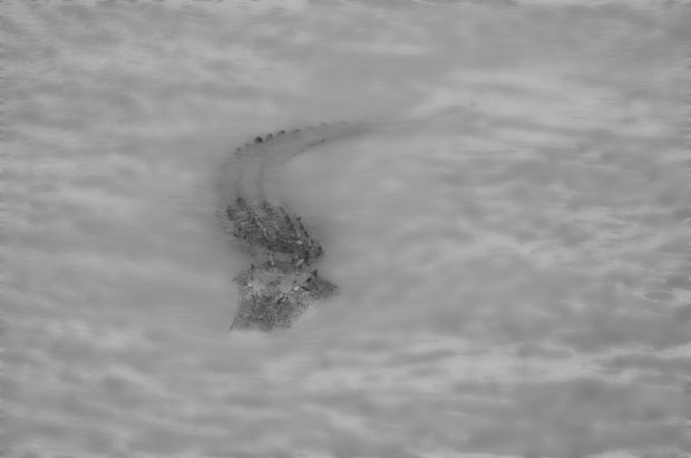 A photograph taken on Adelaide River whilst fishing off a boat a crocodile cruises towards us. The ulimate prey animal