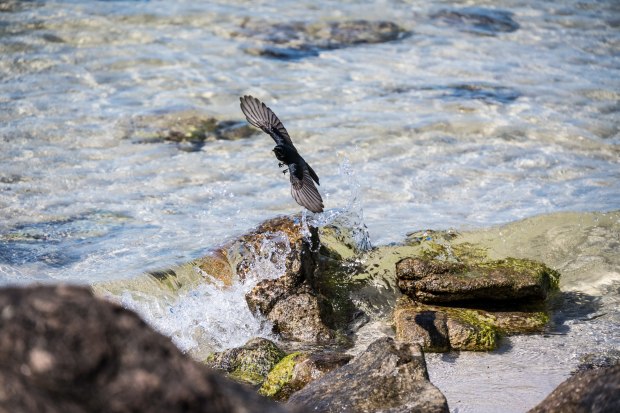 Willy wagtail was having a flit back and forth landing on the rocks and dodging the waves.