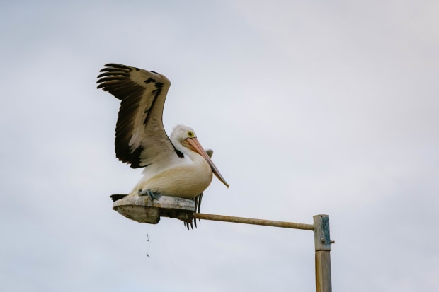 A pelican pauses to stretch, each feather catching the light in a moment of balance and poise.