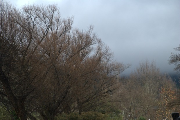 The bare trees and the fog from the mountain cover the town