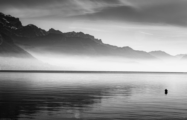 Fog rolling over lake Annecy, France