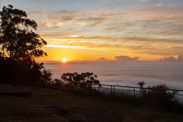 Winter sunrise across Nepean valley (Castlereagh) from Hawkesbury lookout, Yellomundee Regional park, Blue Mountains.