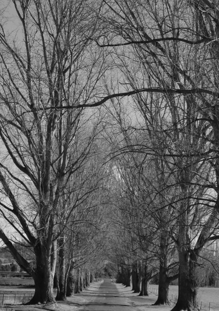 Deciduous trees in mono leading the eye down a road.