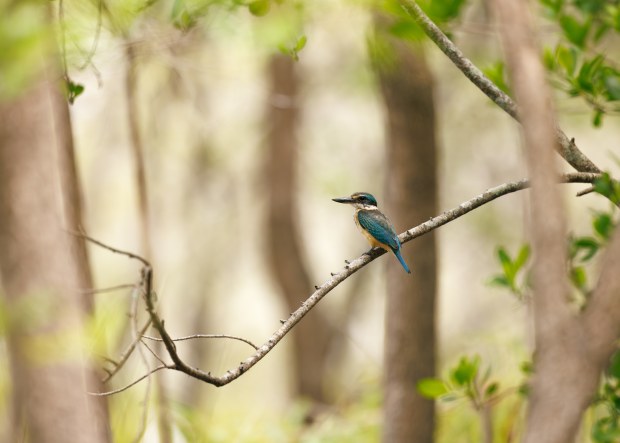 A Sacred Kingfisher perched quietly among the trees in its natural woodland habitat in Queensland.