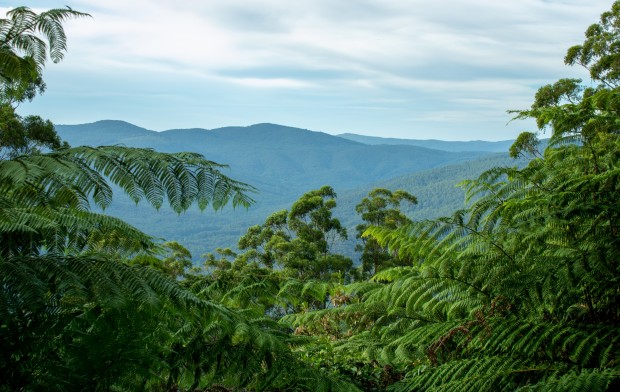 View of Yarra Valley between the ferns from Mt Donna Buang, Warburton Vic