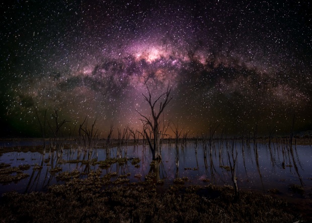 The vast Milky Way arches overhead like a luminous river of light, flowing across the endless dark skies above Yenyening Lakes in Western Australia's Wheatbelt. Captured in pristine Bortle 1-2 conditions roughly two hours east of Perth, the full galactic arc stretches from horizon to horizon over the cracked salt pans and ephemeral waters, a breathtaking reminder of our place in the cosmos under one of the region's darkest and most accessible night skies.