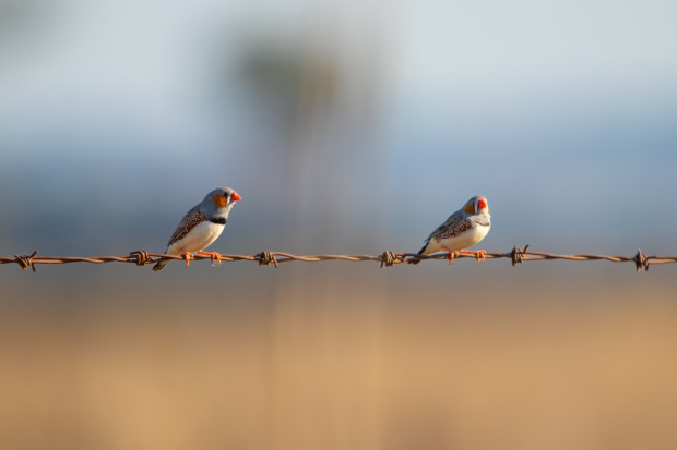 A pair of zebra finch males on a fence in Oakey, QLD